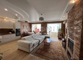 Большие арочные окна ,перепланировка полностью узаконена, две спальни с французскими окнами — запад., третья спальня и гостиная с кухней восток, два санузла, вместительная гардеробная на входе, кондиционер Mitsubishi , камин в отличном состоянии, мощная тяга, остаётся кухонный гарнитур со встроенной техникой, большой диван, встроенная мебель (в санузлах, спальне), шкафы и стеллажи в гардеробной., шторы на больших окнах в гостиной., лестница 6 метров в подарок (чтобы обеспечить доступ к высоким окнам).